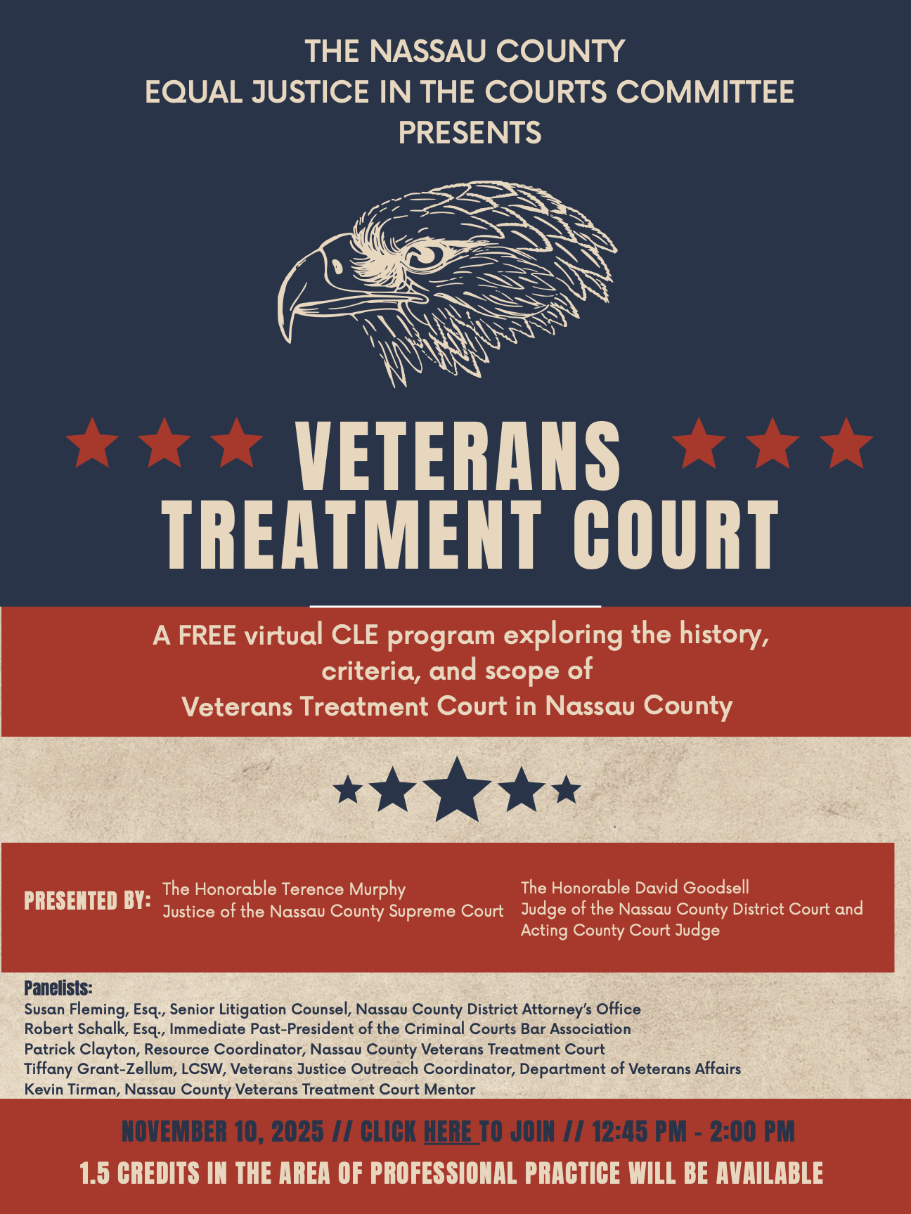The Nassau County Equal Justice in the Courts Committee presents a free virtual CLE highlighting the Veterans Treatment Court. This program will explore the history, criteria, and scope of the Veterans Treatment Court in Nassau County.
