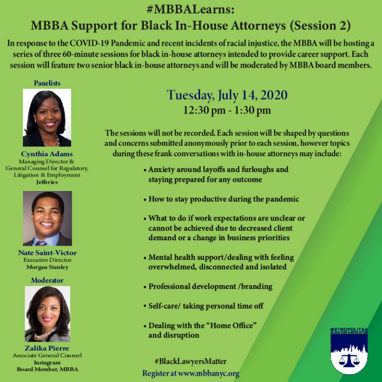In response to the COVID-19 Pandemic and recent incidents of racial injustice, the MBBA will be hosting a series of three 60-minute sessions for black in-house attorneys intended to provide career support. Each session will feature two senior black in-house attorneys and will be moderated MBBA board members. 5:30 PM – 6:30 PM. Click here or the image below to RSVP.