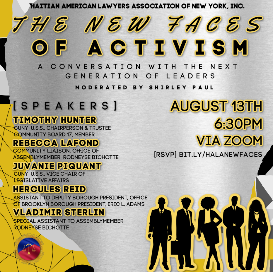 HALANY invites you to join us for The New Faces of Activism: A Conversation with the Next Generation of Leaders. As Barack Obama said, "change will not come if we wait for some other person, or if we wait for some other time. We are the ones we’ve been waiting for. We are the change that we seek." The speakers joining us are the embodiment of the change we speak in today's social, political and economic climate. Join us for a conversation with the young professionals and college students that are emerging as leaders and activist in New York City. Our discussion will be moderated by attorney and HALANY member, Shirley Paul. Our featured speakers include: Timothy Hunter - CUNY U.S.S., Chairperson & Trustee