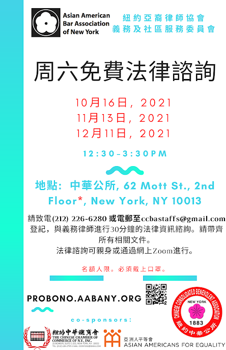 AABANY's Pro Bono & Community Service Committee is seeking volunteers for the last three hybrid monthly clinics of the year: October 16, November 13, and December 11. Each of these clinics will take place on Saturday from 12:30pm to 3:30pm at the Chinese Consolidated Benevolent Association (CCBA) at 62 Mott Street, 2nd Floor, New York, NY 10013. Both volunteers and clients will also have the option to attend remotely via Zoom. Please feel free to forward the below flyers to anyone who may be interested in attending the pro bono clinics. We are seeking both volunteer attorneys and language interpreters. Attorney volunteers do not need to be specialists or have expertise in a specific area of law, but should have experience in client intake and consultation. Attorney volunteers will only be rendering legal advice and information, and will not take on any legal representation. Interpreter volunteers should be fluent in English and at least one of the following languages: Cantonese Chinese, Mandarin Chinese, Japanese, or other Asian languages or dialects. All volunteers must be AABANY members for professional liability coverage purposes. Volunteers may sign up at https://www.aabany.org/page/J2 to become an AABANY member.