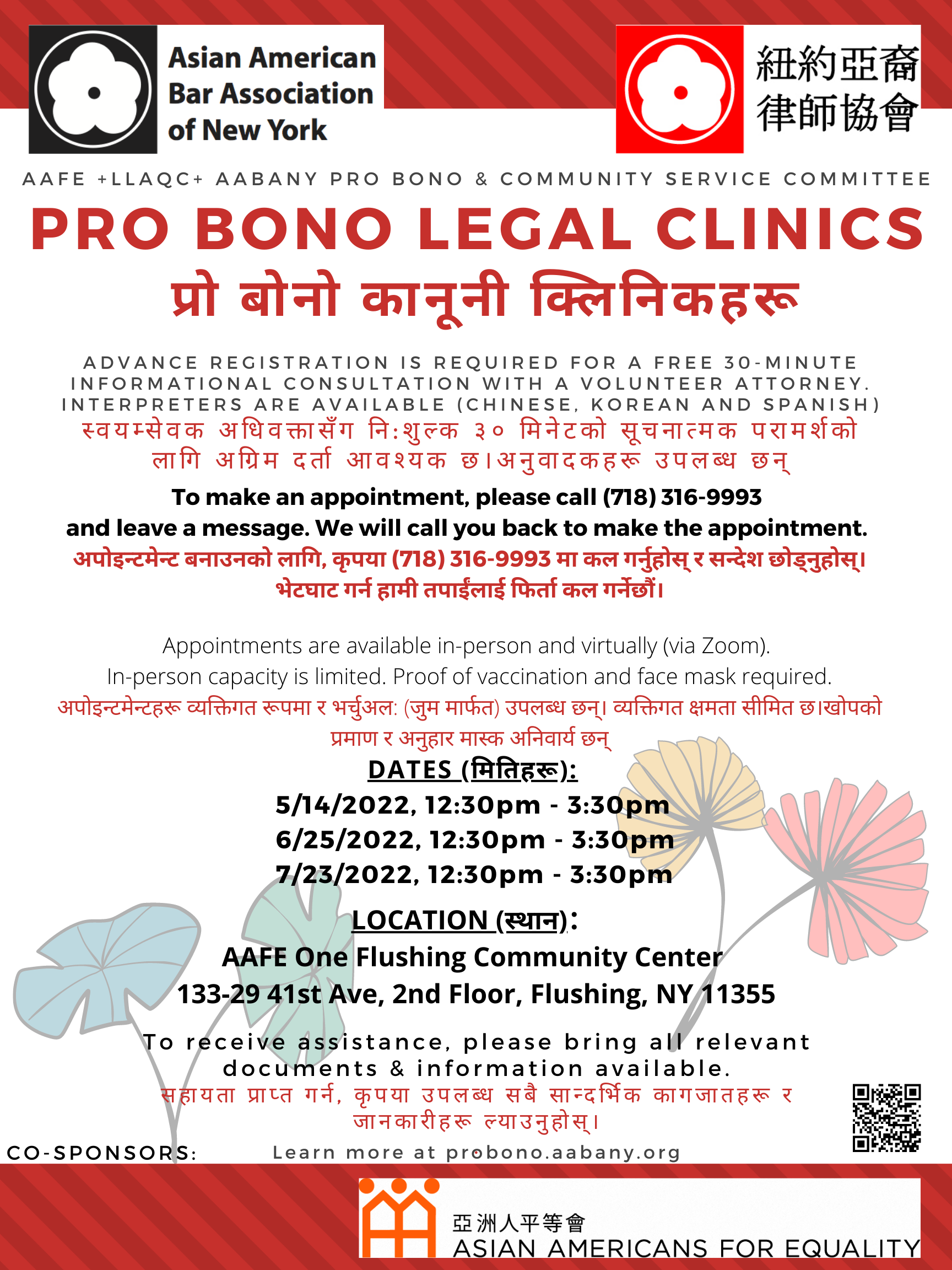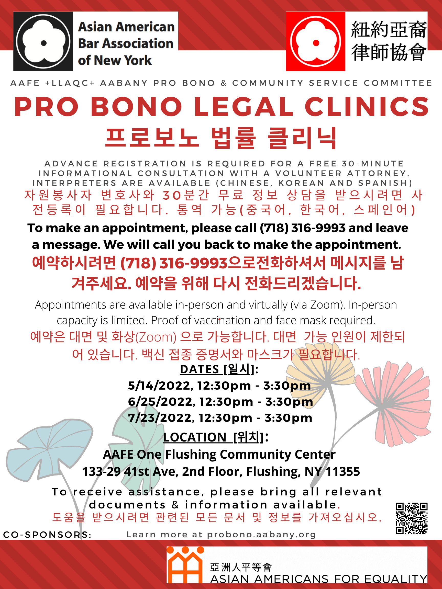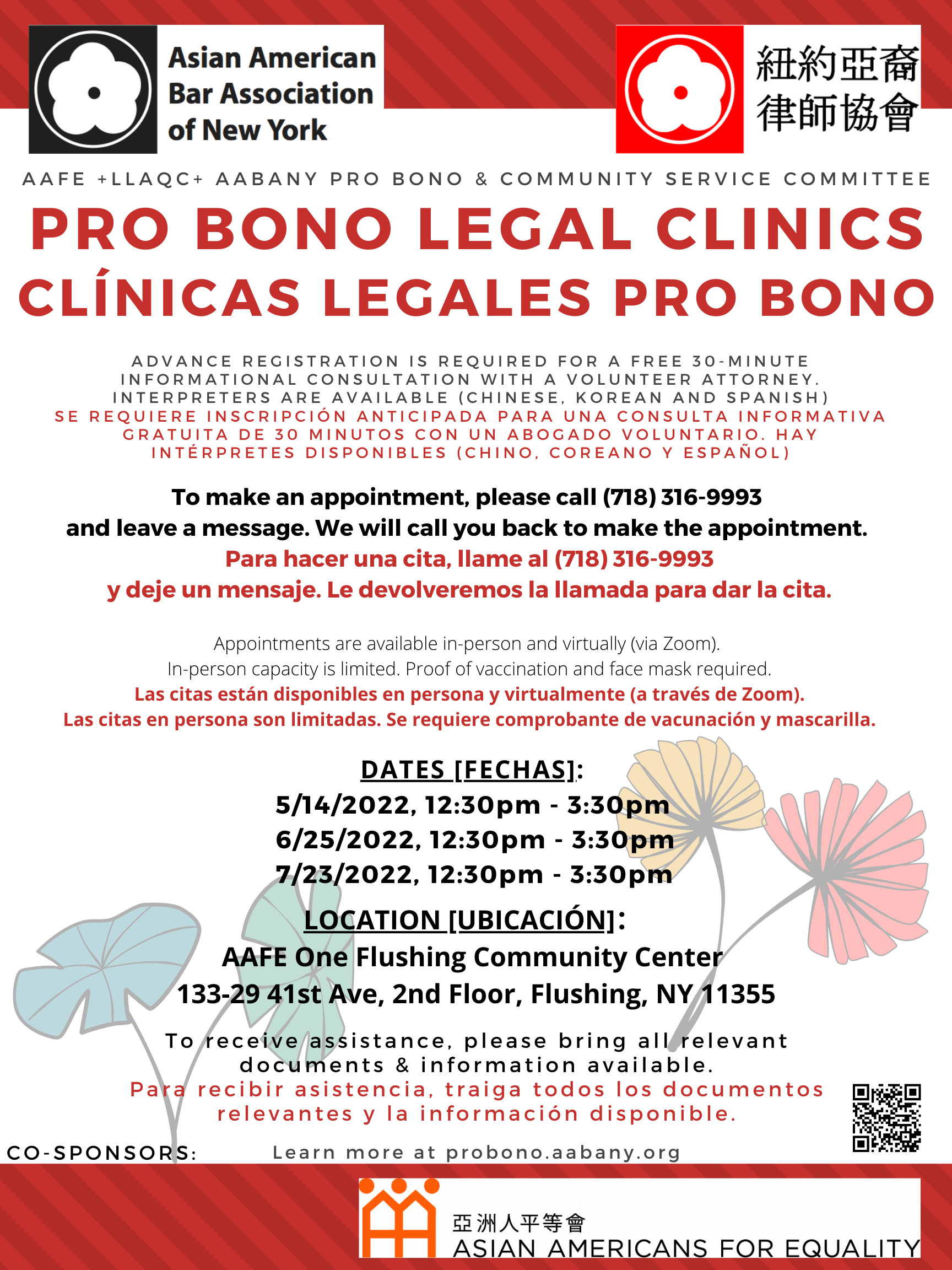 PBCS and the Asian Americans for Equality will be hosting pro bono clinics at Flushing, Queens!