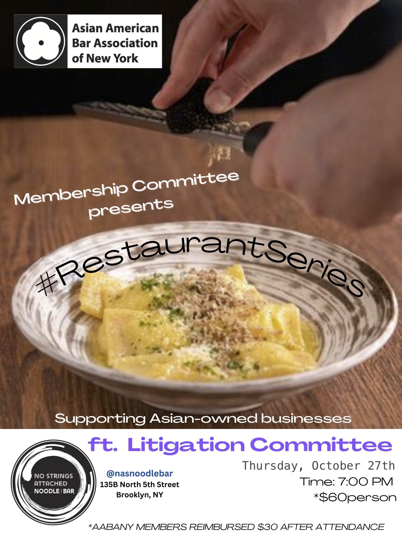 In our continuous efforts to support Asian-owned businesses, please join AABANY members on Thursday, October 27th @7pm for a hearty dinner at No Strings Attached Noodle Bar as we ease into the Fall season. Spend the evening with the Litigation Committee while you support a local Asian-owned restaurant. Excited to check out NSA Noodle Bar? Click here for a salivating visual.