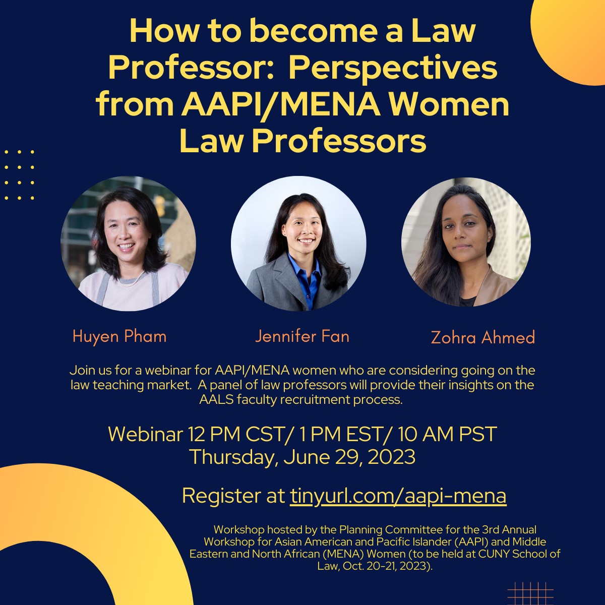 In conjunction with the 3rd Annual Workshop for Asian American Pacific Islander (AAPI) and Middle Eastern & North African (MENA) Women in the Legal Academy (to be held at CUNY School of Law on October 20-21, 2023), we invite you to participate in the webinar for AAPI/MENA women who are planning to go on the law teaching market this fall. A panel of law professors will discuss the FAR and the AALS faculty recruitment process and provide advice. The webinar will be held on Thursday, June 29, at 12 pm CST (1 pm EST/10 am PST).