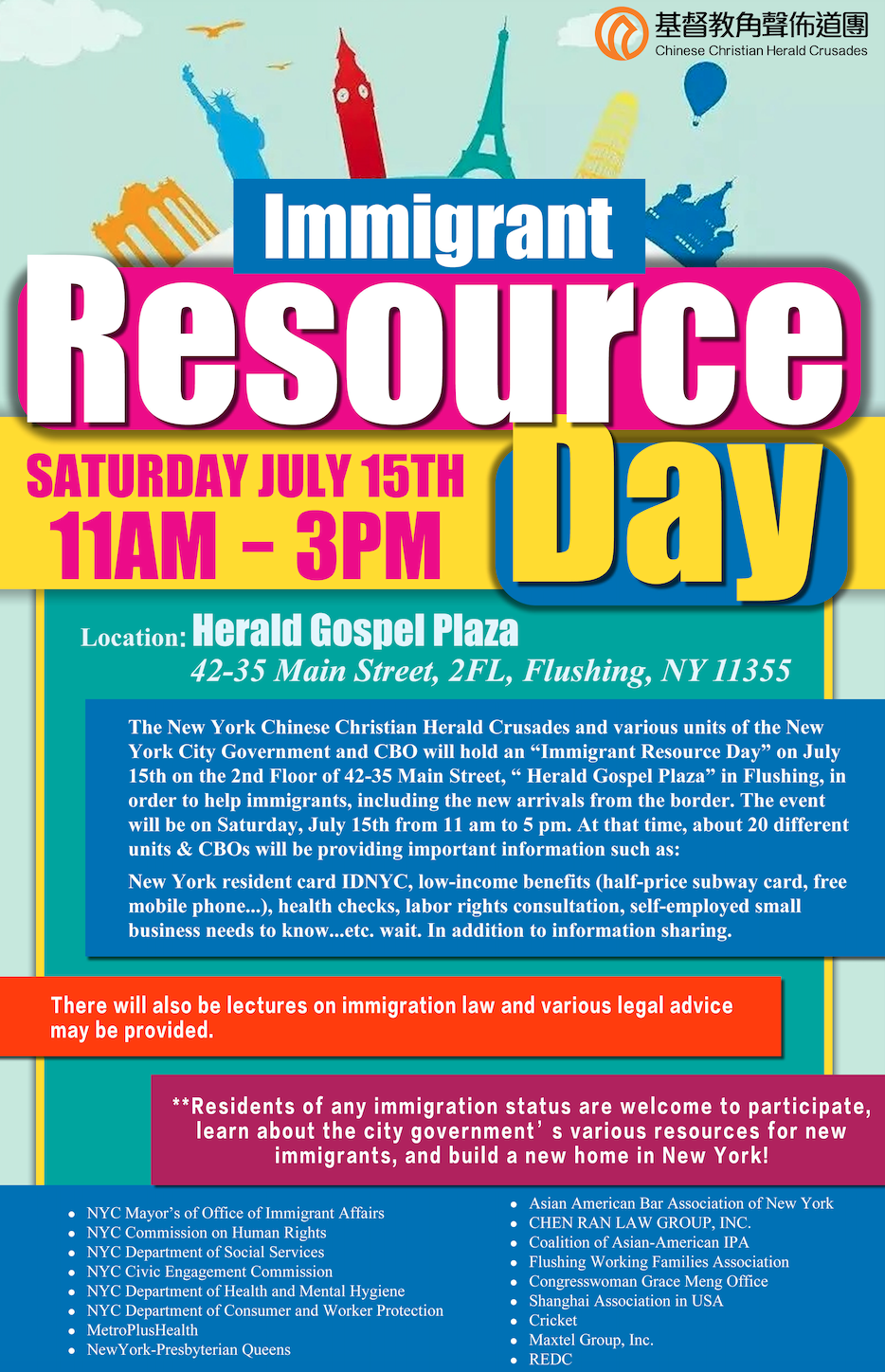 Also, don't miss out on the enlightening community presentation by the Immigration Committee at the community fair! Date: Saturday, July 15, 2023 Time: 11am - 3pm (clinic will start approximately 12pm) Location: Chinese Christian Herald Crusades, 42-35 Main Street, 2nd fl, Flushing, NY 11355 To register to be a volunteer: https://forms.gle/a5ML4UzTNZscWPwMA. DEADLINE: July 12