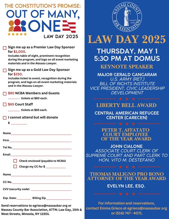 The event will also have keynote speaker Maj. Gerald Gangaram (Ret.). For information and reservations for this event, please email egrieco@nassaubar.org.