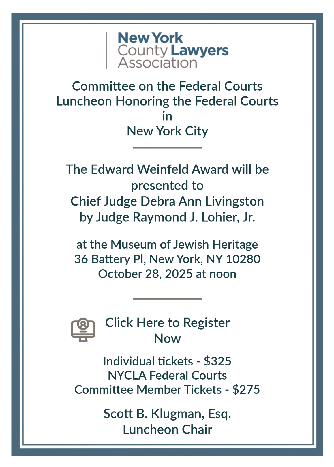 The 2025 NYCLA Federal Courts Committee Edward Weinfeld Luncheon will be held on October 28, 2025 at the Museum of Jewish Heritage. Register HERE