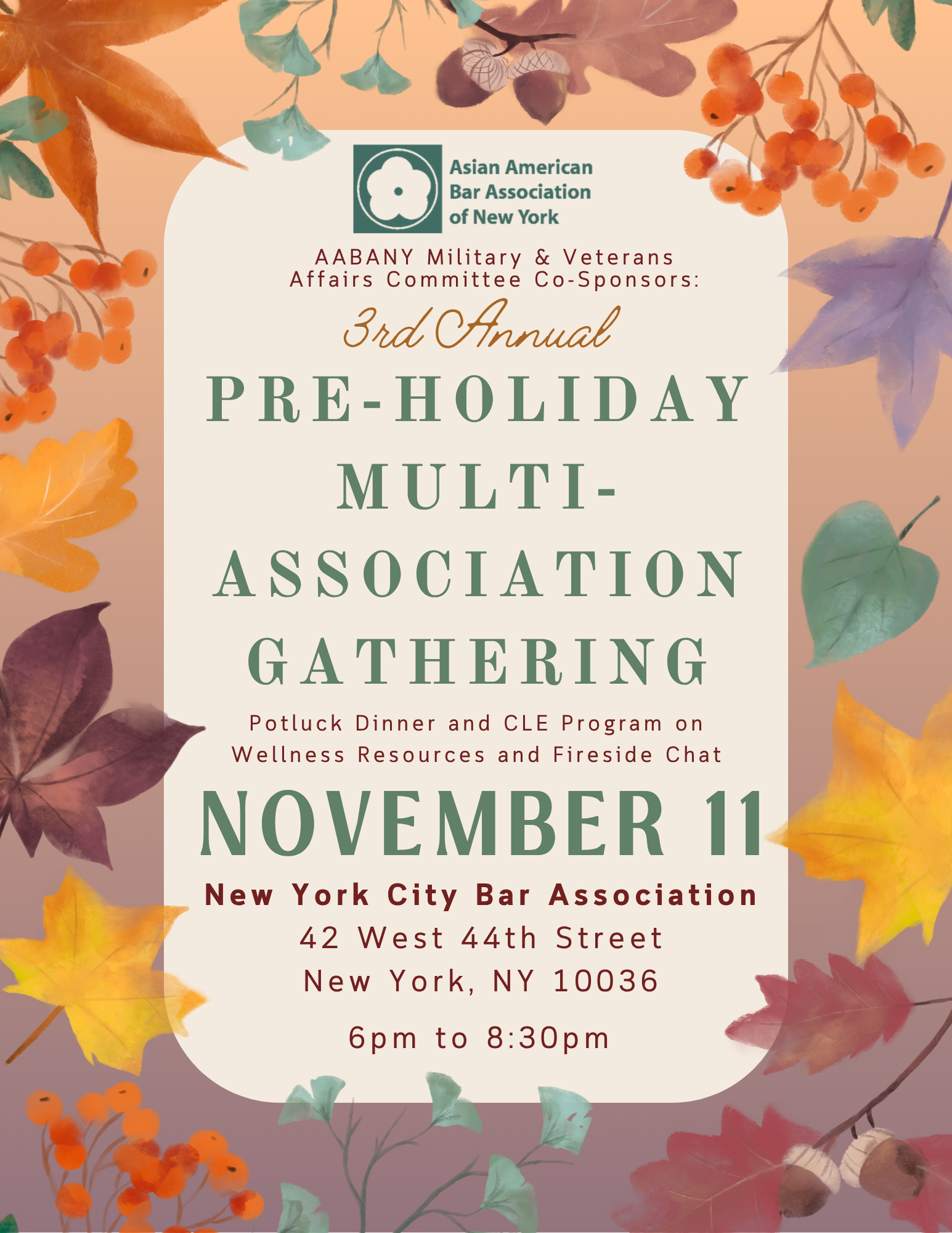 AABANY is excited to share that it will be sponsoring its 3rd Annual Pre-Holiday Multi-Association Gathering on Tuesday, November 11 at 6:00 p.m. There will be a Potluck Dinner and CLE Program* on Wellness Resources. The New York City Bar Association will be hosting, and they are located at 42 W 44th Street, New York, NY 10036.
