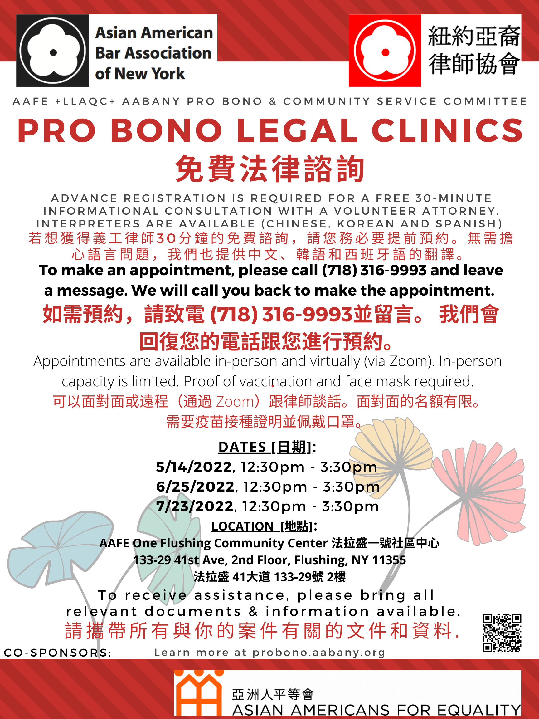 - AABANY PBCS + AAFE Present: Queens Pro Bono Legal Clinic, July 23