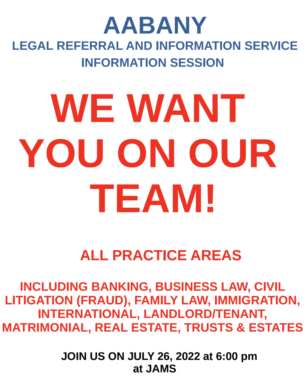 - AABANY Presents: Legal Referral and Information Service Information Session, July 26