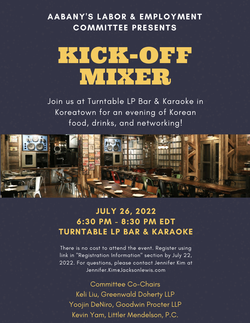 - AABANY's Labor & Employment Committee Presents: Kick-off Mixer, July 26