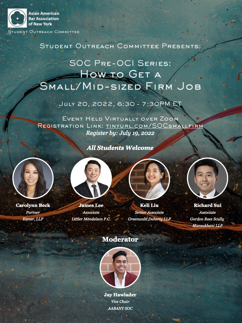 - AABANY SOC Committee Presents: Pre-OCI Series - How to Get a Small/Mid-Sized Firm Job, July 20