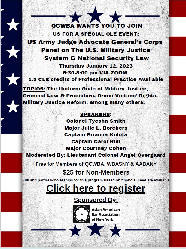 | When: 01/12/2023 6:30-8:00 PM Via Zoom Queens County Women's Bar Association (QCWBA) and the US Army Judge Advocate General’s Corps, proudly present a panel on the U.S. Military Justice System & National Security Law. This event is also sponsored by AABANY and free to all AABANY members. Event will take place by zoom on Thursday, January 12, 2023 from 6:30 to 8:00 PM. We look forward to seeing you at the CLE.