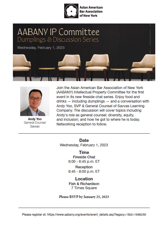 - February 1: AABANY IP Committee Presents: Dumplings & Discussion Series, feat. Andy Yoo. For more information, click here.