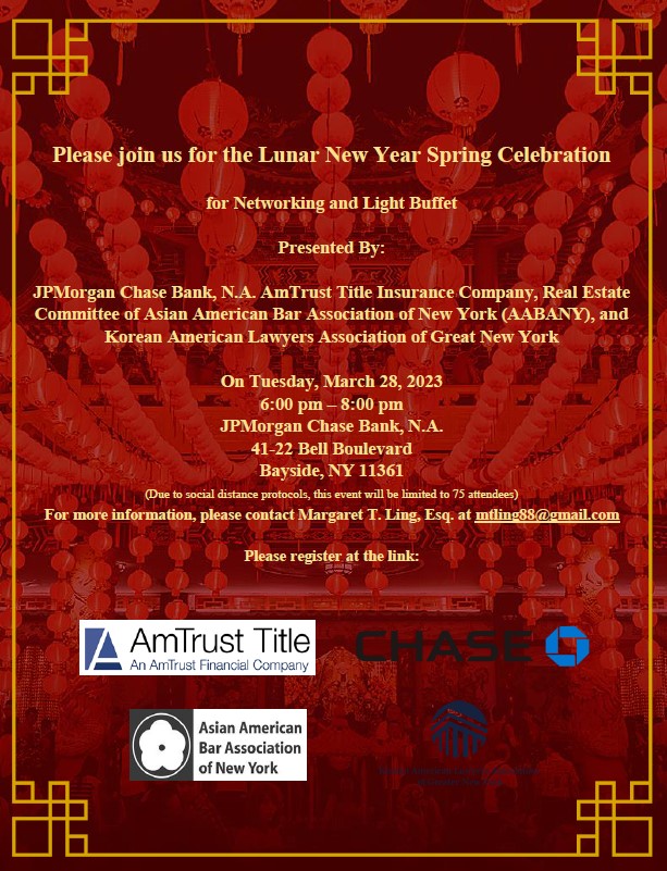 - March 28: AABANY's Real Estate Committee Co-hosts: Lunar New Year Spring Celebration. For more information, click here.