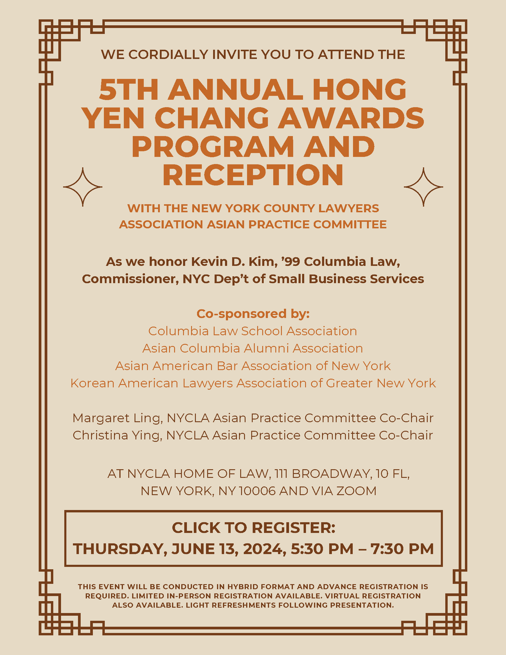 When: 06/13/2024 5:00 PM - 7:00PM Where: NYCLA, 111 Broadway, New York, NY 10006 AABANY is pleased to co-sponsor the 5th Annual Hong Yen Chang Award and congratulates this year's award recipient NYC SBA Commissioner, Kevin Kim, Columbia Law School Alum. To register please click on the flyer below. If you have any questions please email Margaret Ling at Mtling88@gmail.com