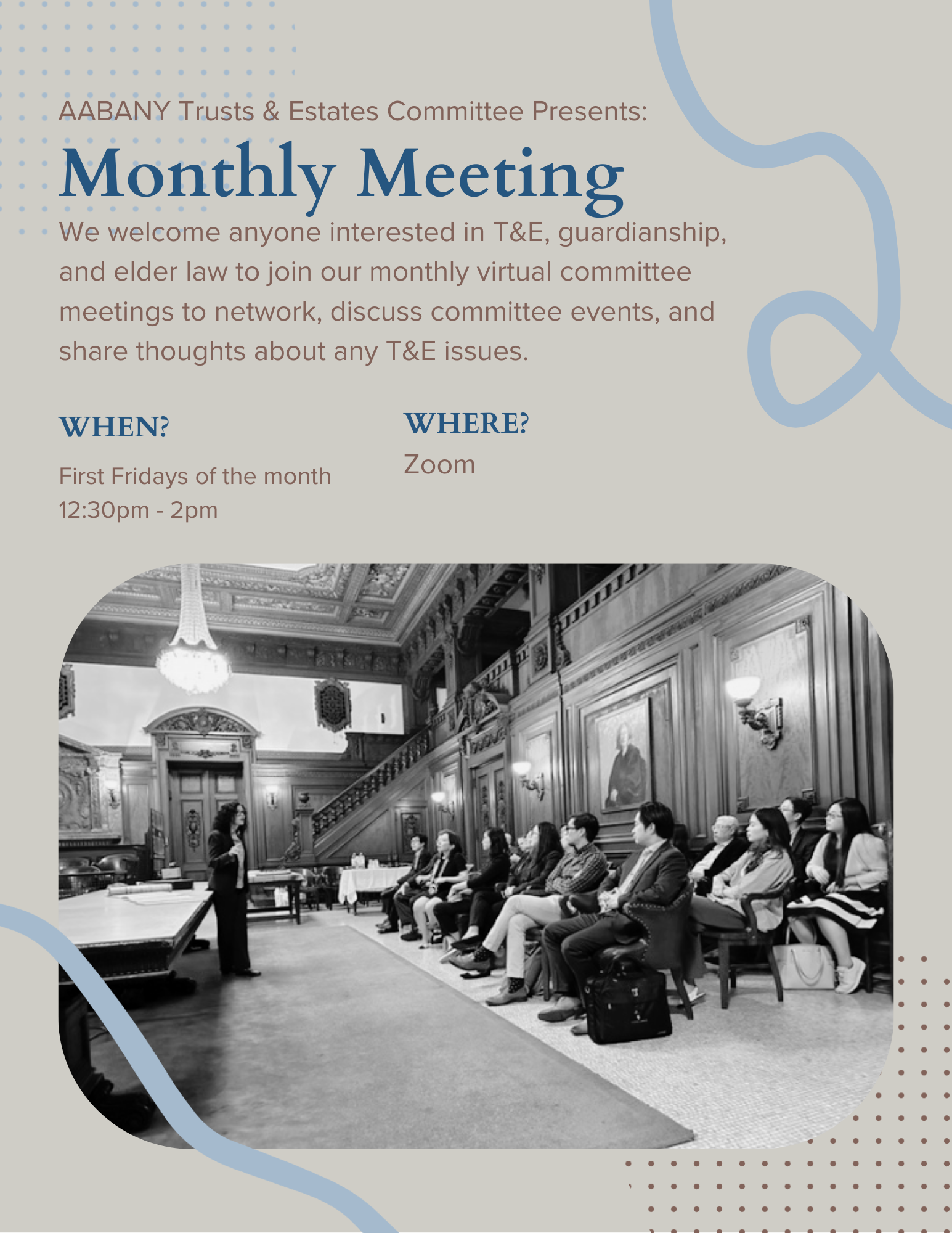The Trusts & Estates Committee of AABANY will host its monthly meeting virtually during a brown bag session. We welcome practitioners
