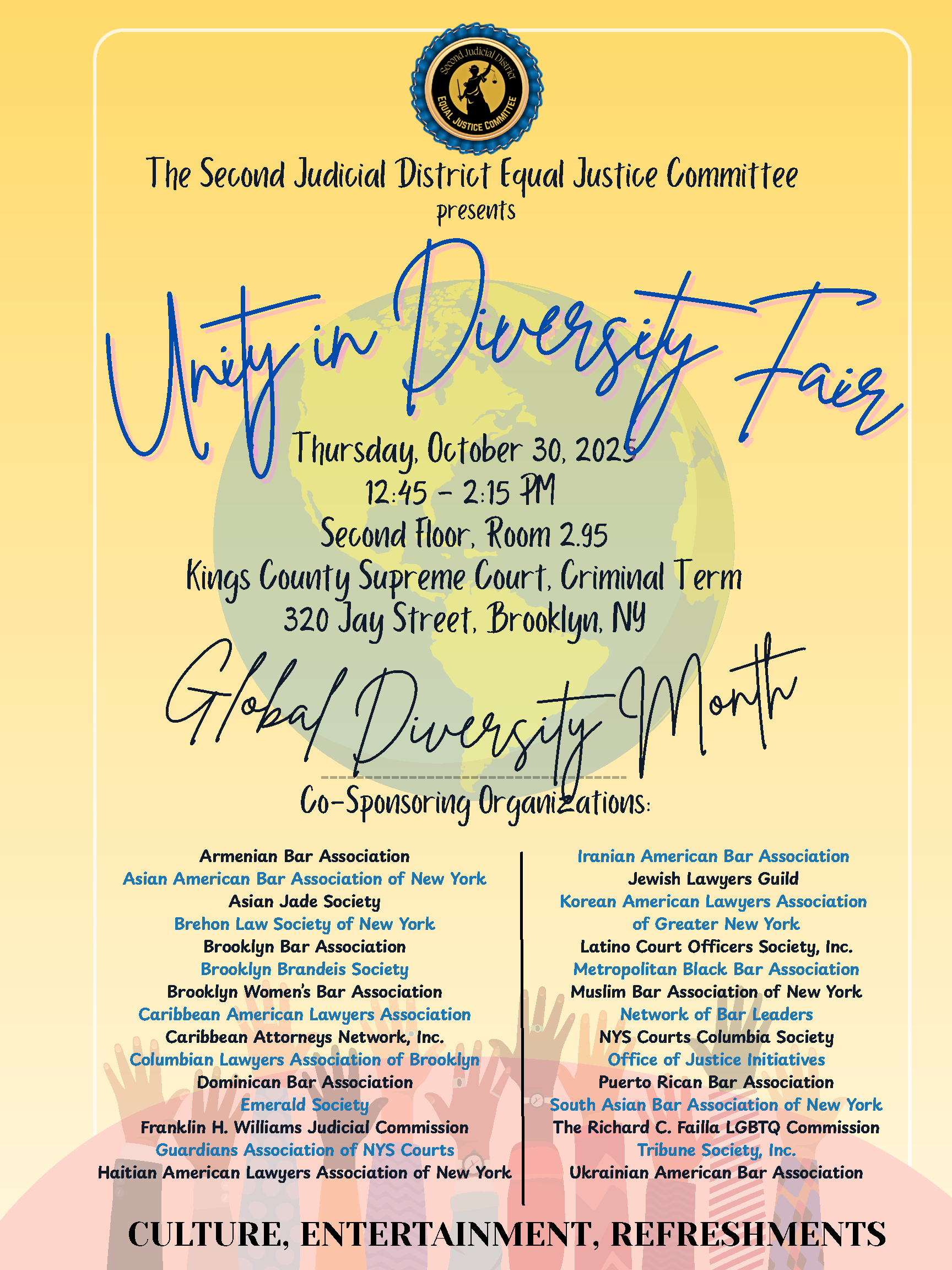 Join AABANY in the Unity in Diversity Fair -- a fair celebrating different cultures in the judicial system! Entertainment and refreshments will be served.