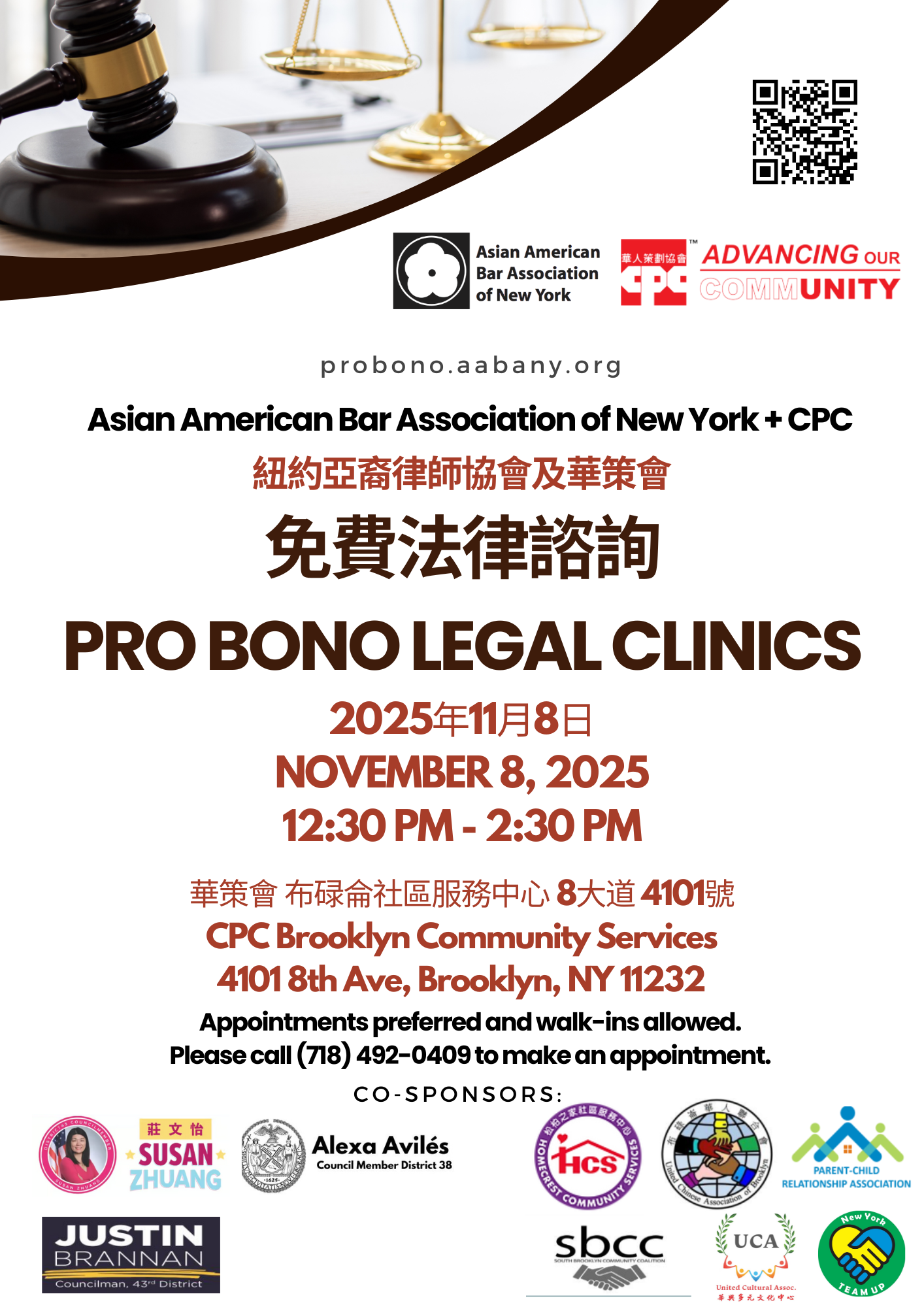 November 8: AABANY Bi-Monthly Brooklyn Pro Bono Legal Clinic. For more details and to register by Nov 6, click here.