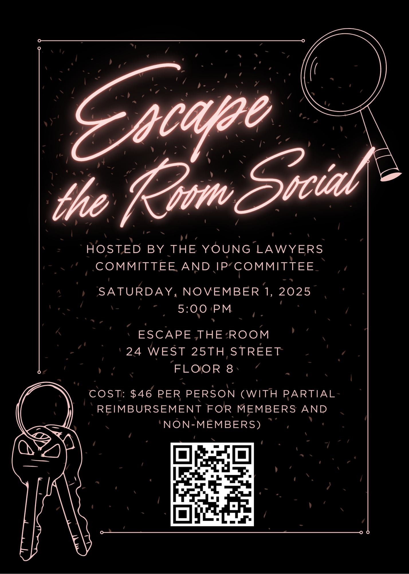 Join the Young Lawyers Committee and IP Committee for a fun Escape the Room social event. Participants will work together to solve puzzles, unlock clues, and “escape” before time runs out. This is a great opportunity to meet members from