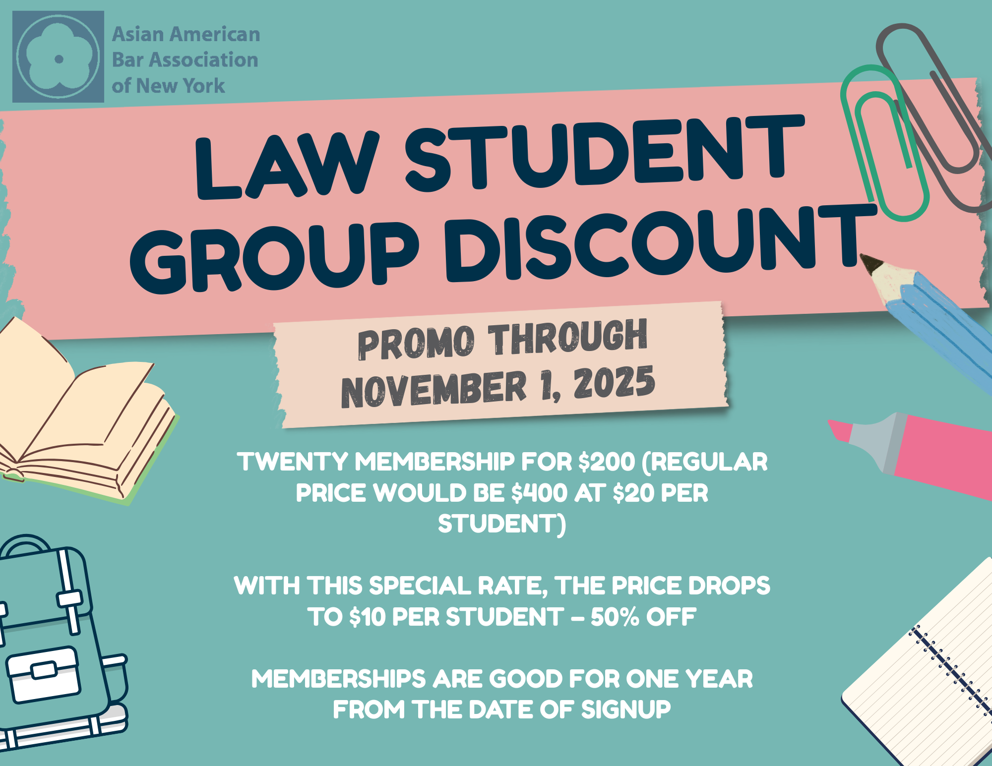 November 1: [DEADLINE] AABANY Law Student Group Discount 2025. For more details, click here.
