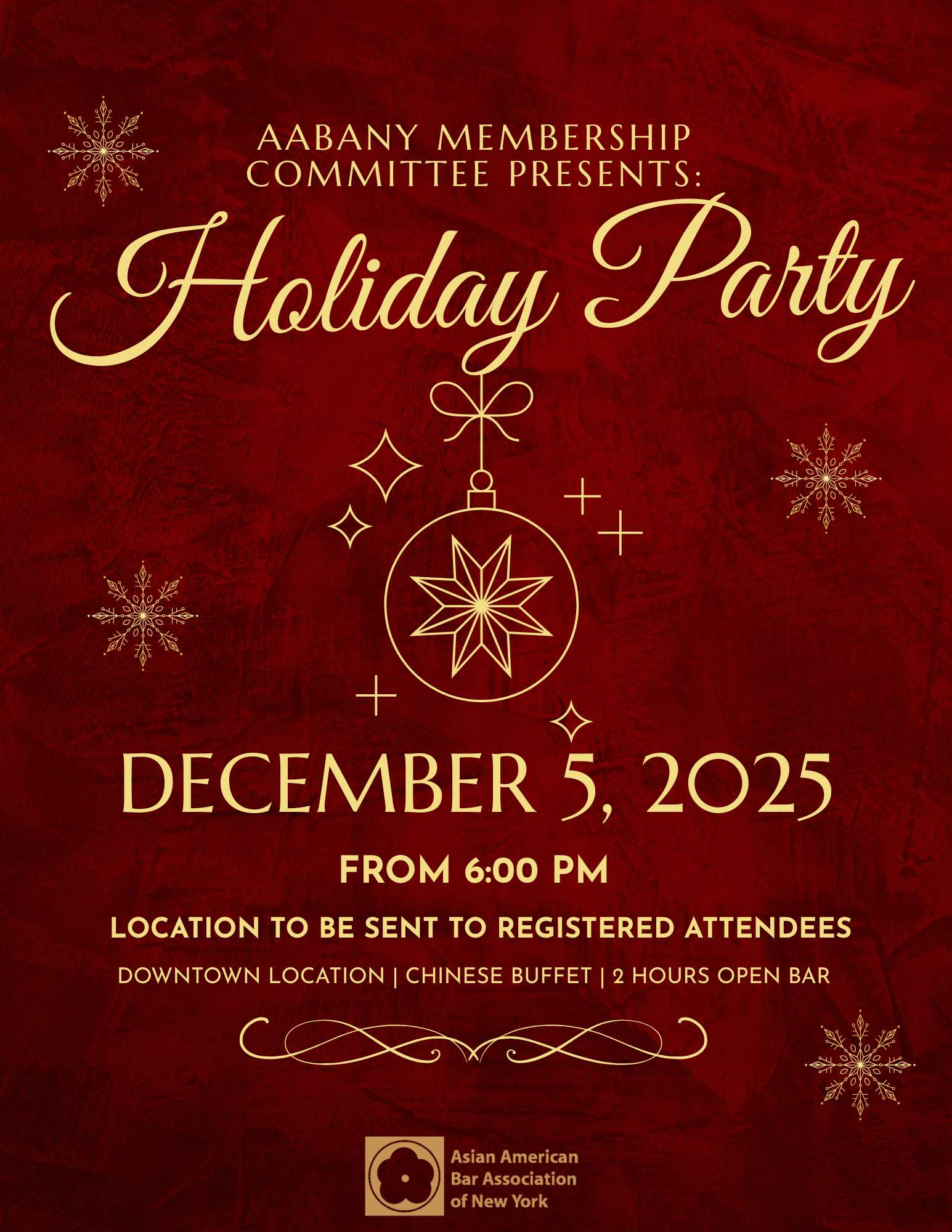 AABANY is pleased to announce that our Annual Holiday Party will take place on Friday, December 5, at a location in downtown Manhattan, serving a buffet of classic Chinese cuisine with two hours of open bar. We will send the details to all registrants closer to the date of the event. There will be plenty of food, drinks, fun, and holiday cheer. We hope you will be able to join us to celebrate the holiday season.