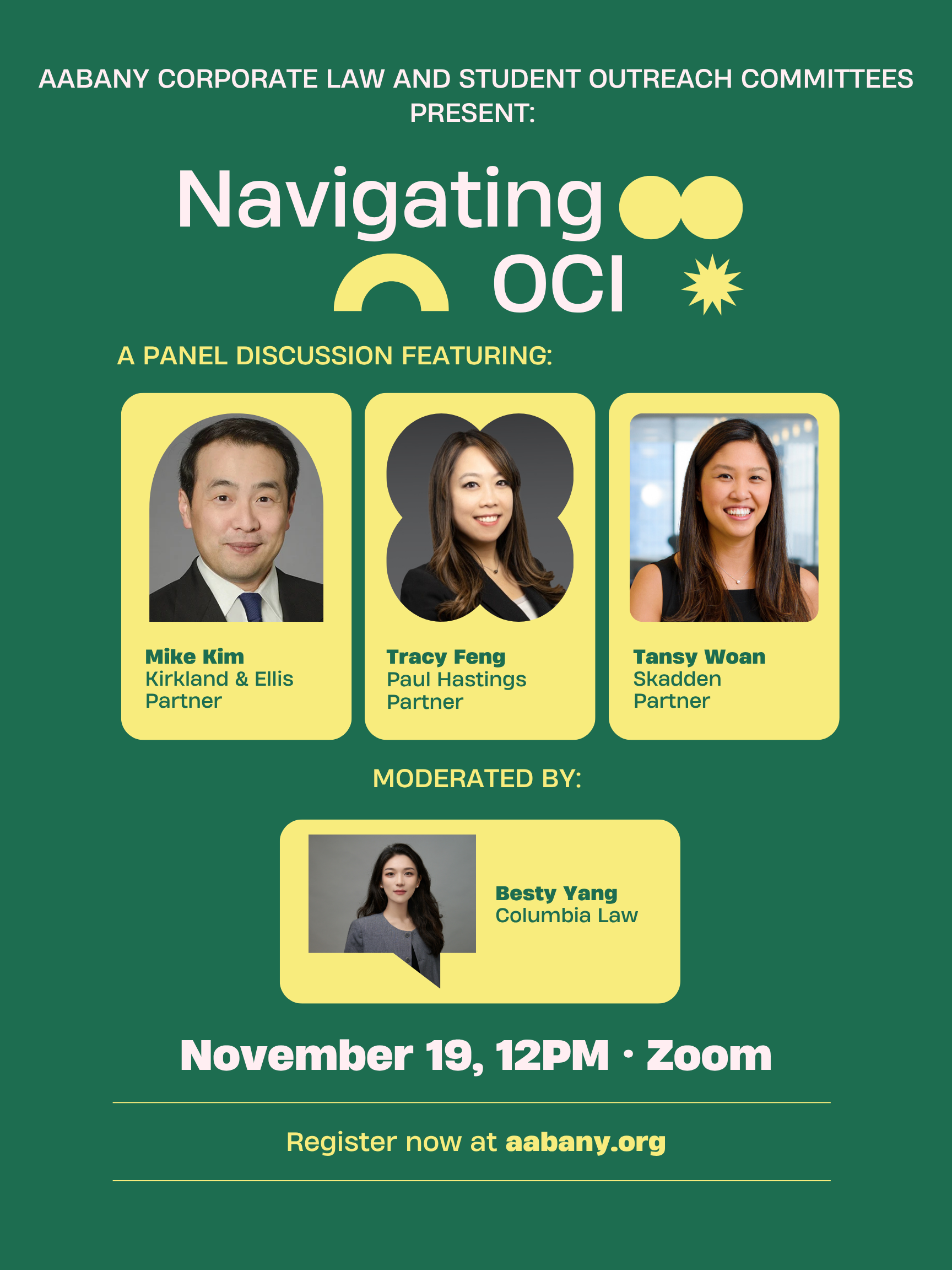 Join AABANY’s Student Outreach Committee and Corporate Law Committee for Navigating OCI: Careers in Corporate Law, a virtual panel featuring corporate attorneys, including Mike Kim (Kirkland & Ellis), Tansy Woan (Skadden), and Tracy