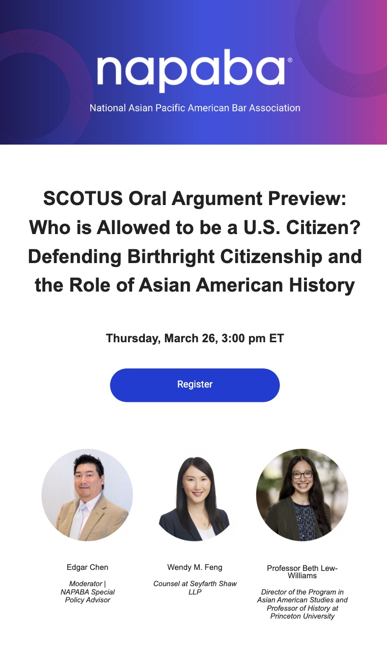 March 26: NAPABA Presents: SCOTUS Oral Argument Preview: Who is Allowed to be a U.S. Citizen? Defending Birthright Citizenship and the Role of Asian American History. For more details and to register, click here.